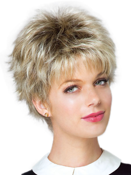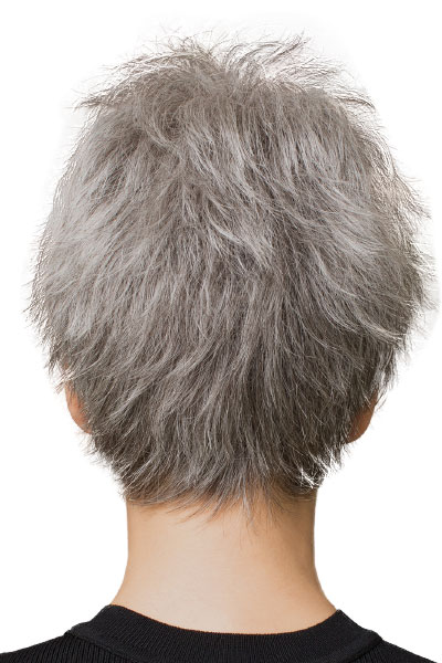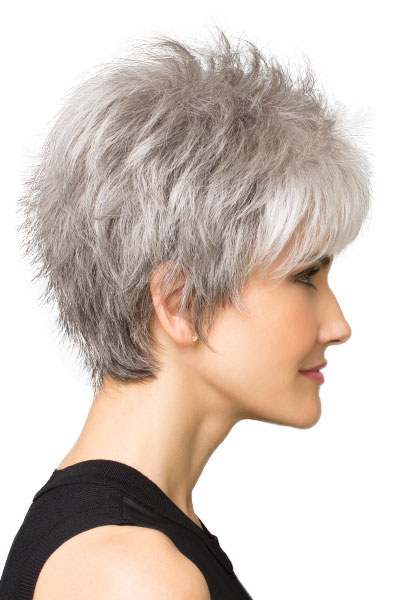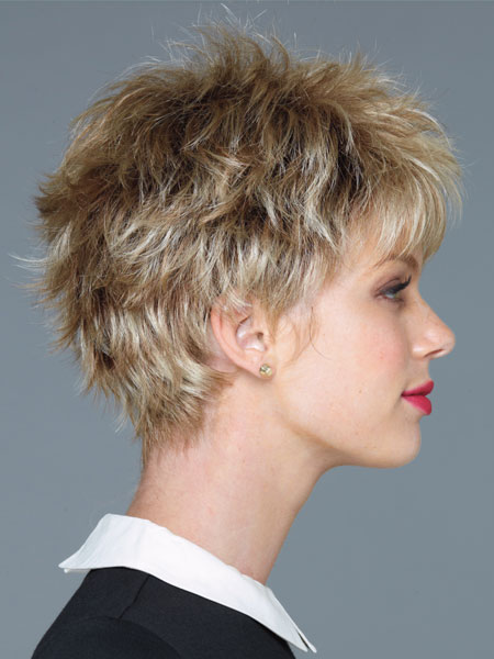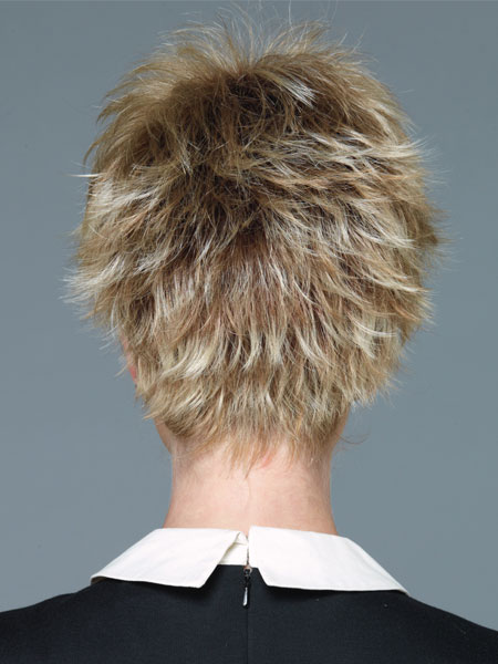 This short spikey style has flared ends and lots of layers. The added volume is enhanced with teasing at the root. The wispy fringe is flattering and natural. Lizzie Wig layers are longer on the top and shorter towards the neckline, which is tapered. Just ‘spike it up’ and go.