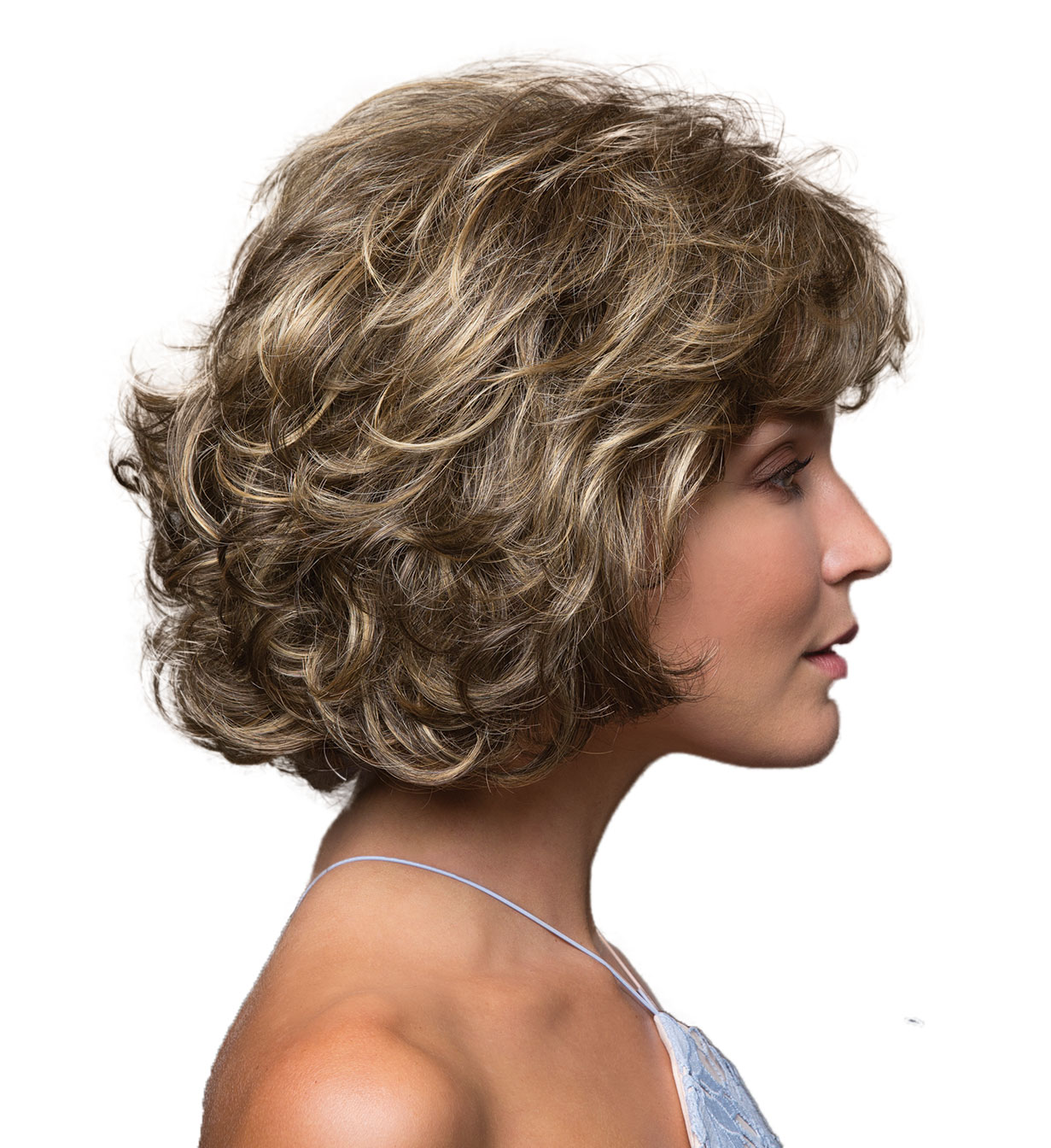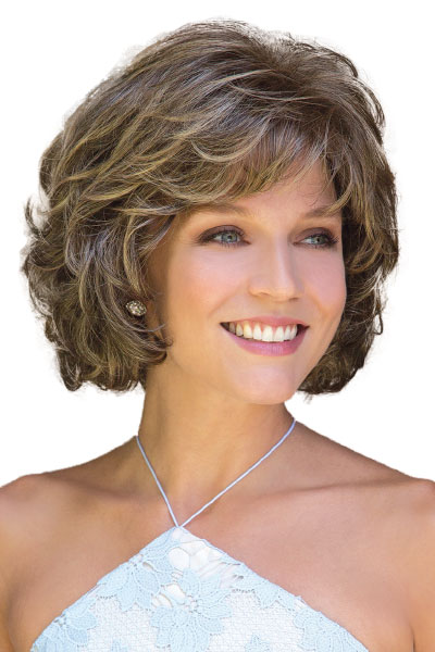 Loose curls that vary in size give you a natural effect. The soft curls blend with a fringe that sweeps to one side to form a face-framing wig with a natural looking rounded fullness. Maria Wig has a slightly smoother top which is not too curly and not too big.
